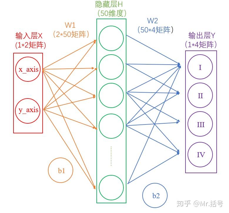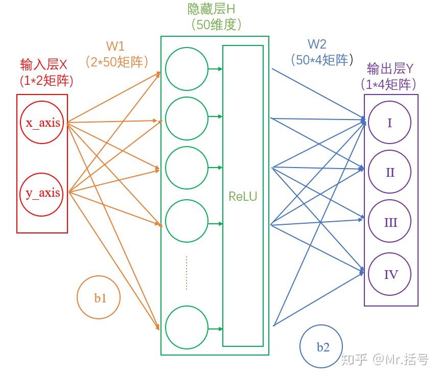 这里我们构建一个两层神经网络,理论上两层神经网络已经可以拟合任意函数。这个神经网络的结构如下图: