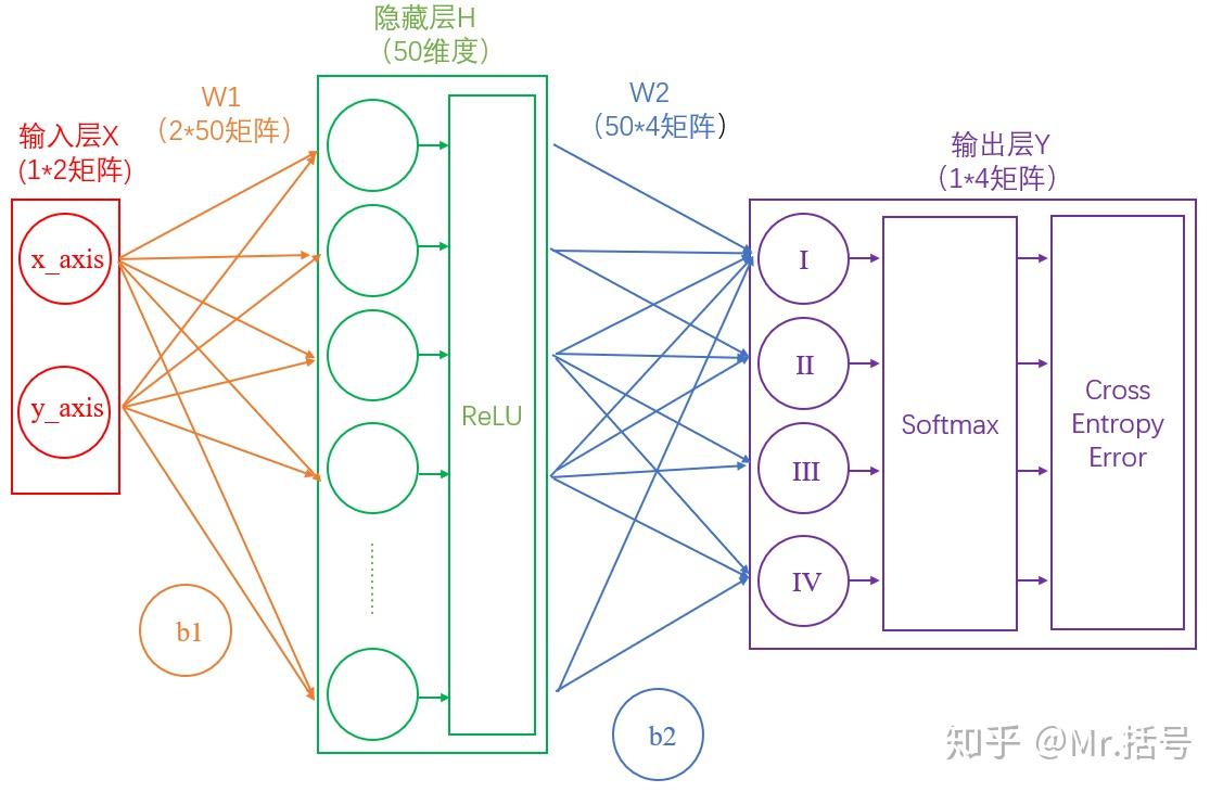 连接隐藏层和输出层的是W2和b2。同样是通过矩阵运算进行的: